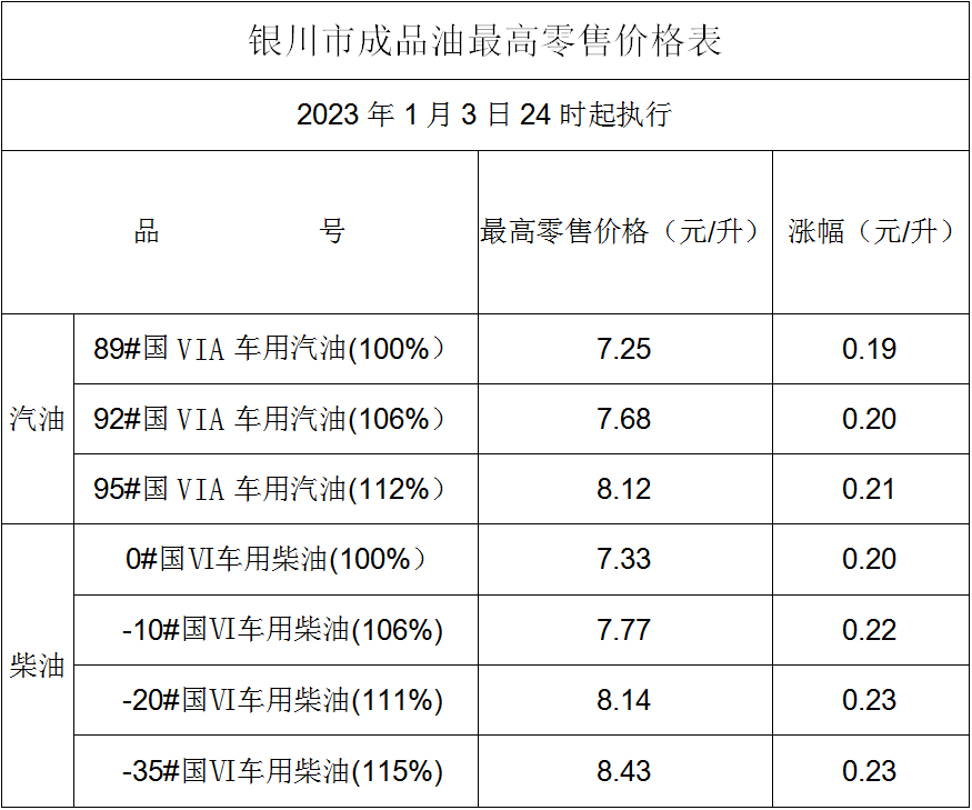 2023年1月4日银川市成品油价格上调