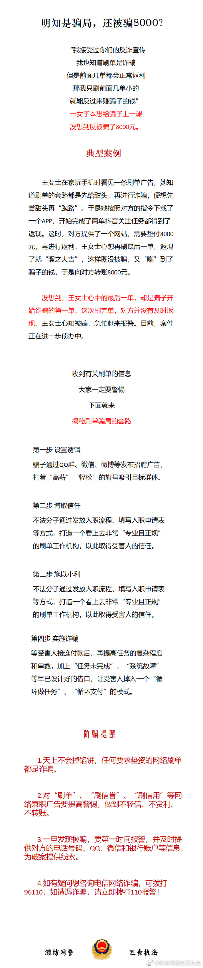 天上不会掉馅饼,任何要求垫资的网络刷单都是诈骗。