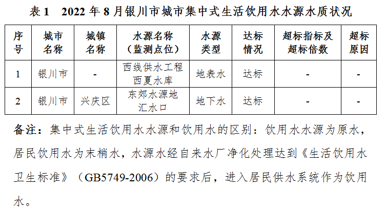 8月份监测的西线供水工程西夏水库地表水型水源水质达标,达标率100%。