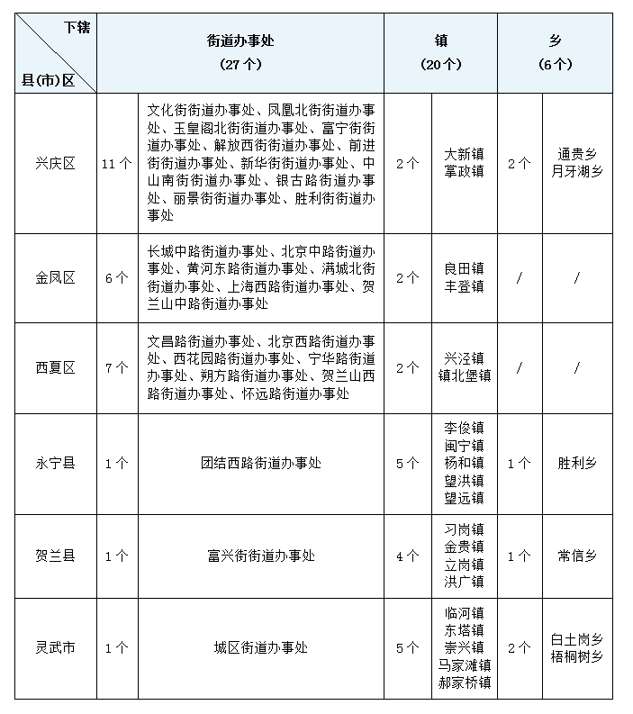 银川市下辖三区两县一市,“三区”即兴庆区、金凤区、西夏区;“两县”即永宁县、贺兰县;“一市”即灵武市。2021年,各县(市)区共辖27个街道办事处、20个镇、6个乡和254个居民委员会、286个村民委员会。