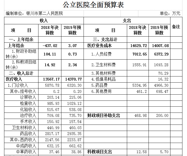 一、2019年银川市第二人民医院全面预算审批表
