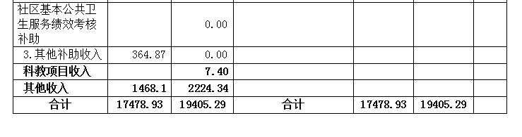 2、财政补助收入。2019年度财政补助收入按财政批复预算数2,799.71万元,其中:离退休人员经费88.17万元,院长年薪制财政补助资金35万元,薪酬总额财政补助资金2,471.74万元,公务员医疗补助4.8万元,取消药品加成财政补助资金200万元。