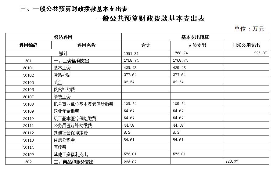 人员经费1991.81万元,主要包括基本工资429.48万元、津贴补贴340.64万元、奖金32.54万元、社会保障缴费271.46万元、其他工资福利支出573.01万元、住房公积金84.61万元、购房补贴37万元;