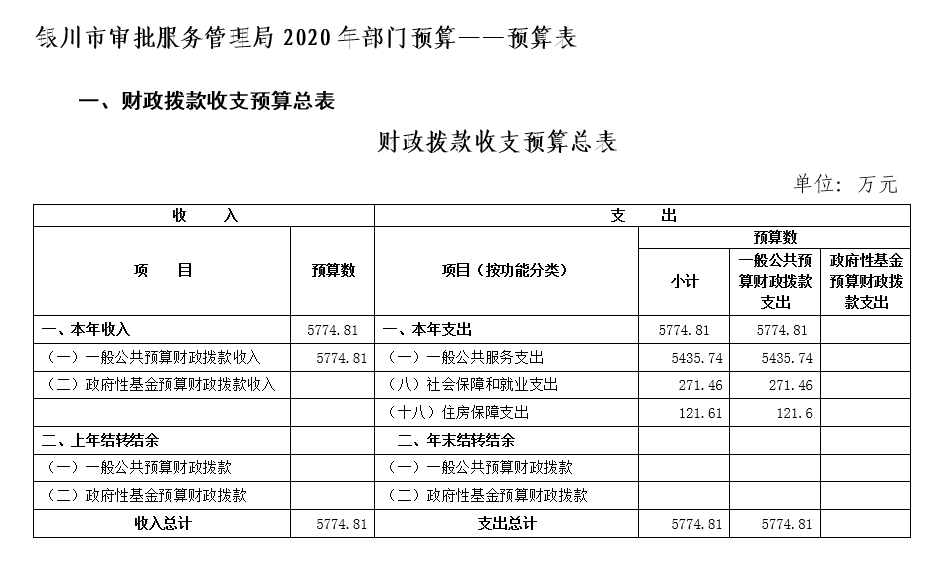银川市审批服务管理局2020年收入总预算5774.81万元,其中:本年收入5774.81万元;支出总预算5774.81万元,其中:本年支出5774.81万元,年末结转结余0万元。