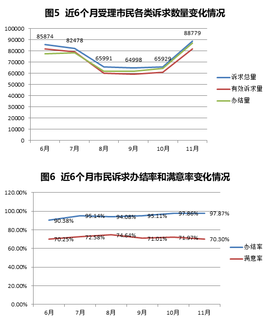 本月受理市民各类诉求88779件,同比2018年11月增长30288件,增幅51.78%,环比上月增长22850件,增幅34.66%。其中,有效诉求81965件,超出受理范围3159件,无效诉求3655件,办结86885件,办结率97.87%,市民回复满意率达到70.30%。
