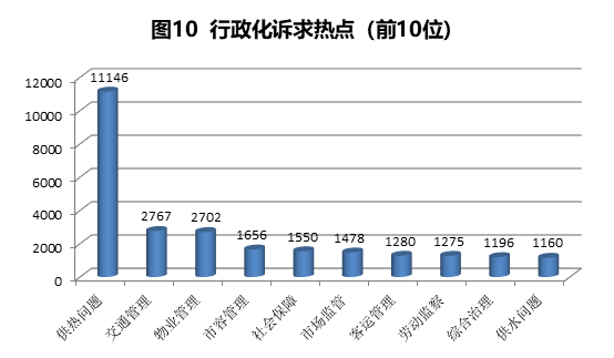 1.供热问题11146件,占行政化诉求的21.14%,主要反映暖气不热、政策咨询、供热费用、供热测试、管道漏水、爆管、单户停暖、区域停暖、供热改造、设施维护(内管网)、设备故障(主管网)、服务态度等方面问题。