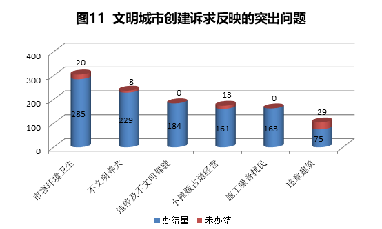 2019年11月,12345热线共受理文明城市创建类诉求1167件,办1097结件,办结率94.00%。主要反映市容环境卫生、不文明养犬、违停及不文明驾驶、小摊贩占道经营、施工噪音扰民、违章建筑等方面问题。