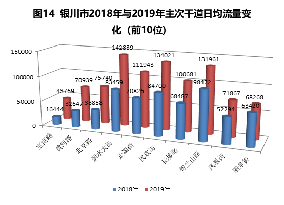 市区主干道路日均过车交通流量与2018年相比均有大幅增长,其中宝湖路,黄河路,北京路,三条主干道日均过车交通流量同比2018年增长50%,增长最为明显。