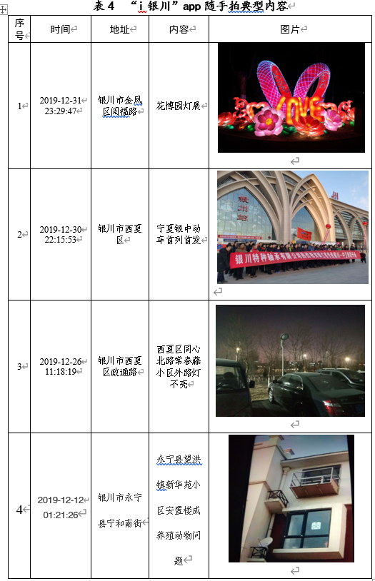 2019年12月,市民通过“i银川”app随手拍功能主动参与到城市治理的各个方面,累计上传随手拍动态40条,主要涉及生活分享、物业管理、交通管理、车辆违停、公共设施、社会治理等方面。