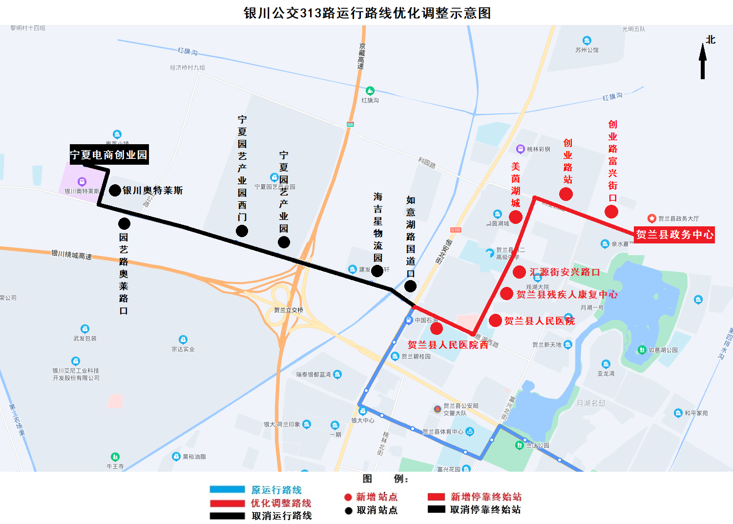优化调整为:银川汽车站(始发)—清和街—109国道—居安路—朔方街—桃源街—富兴街—光明路—109国道—如意湖路—汇源街—创业东路—贺兰县政务中心(终点)