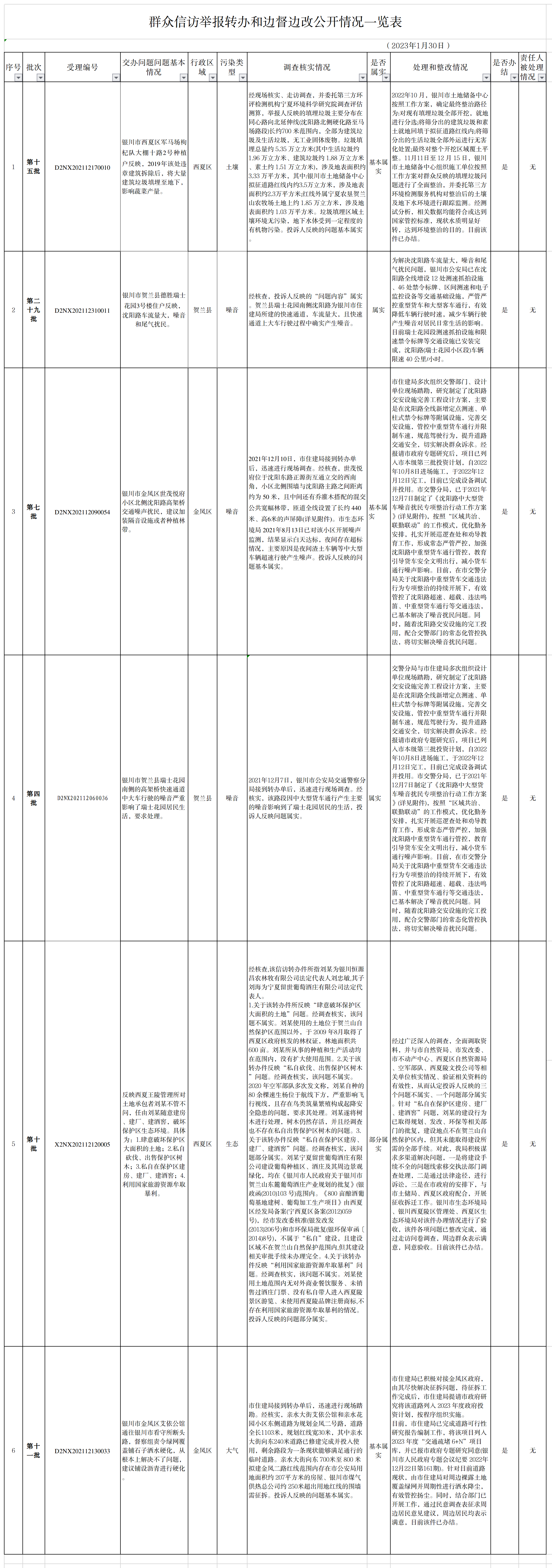 第二轮中央生态环境保护督察期间,银川市共接到中央第四生态环境保护督察组转交群众举报投诉案件33批560件,现将新办结的6件转办件予以公示。截至目前,已办结556件,阶段性办结4件。
