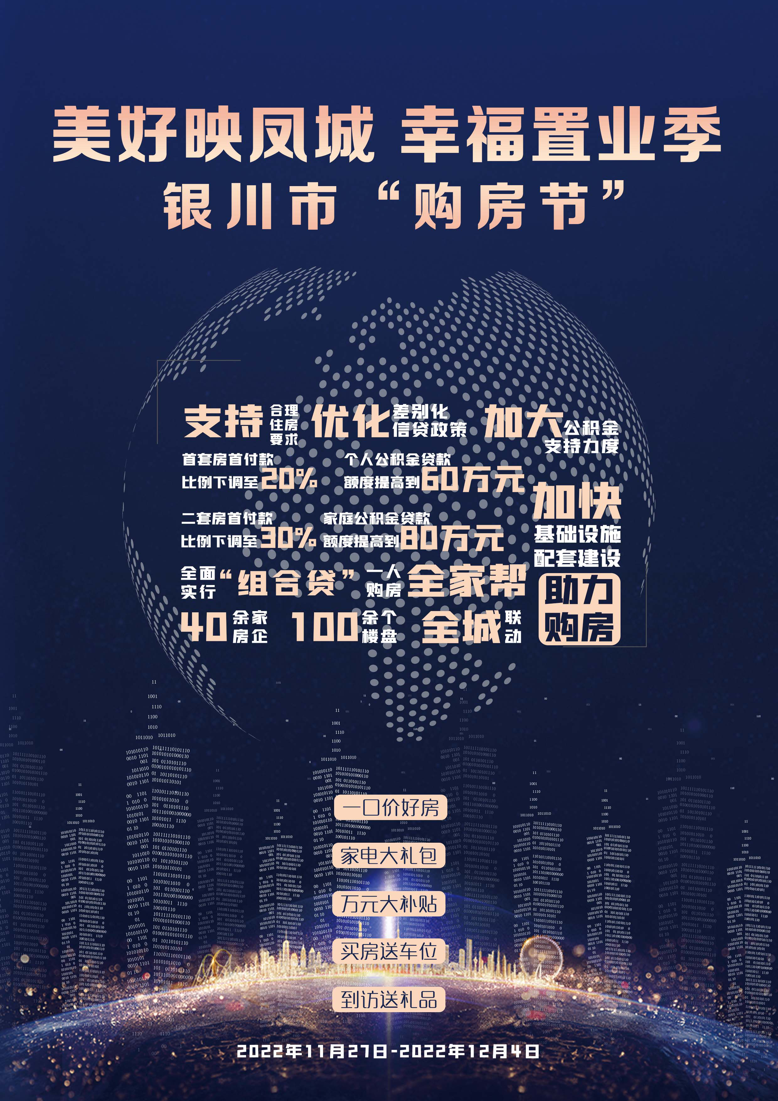 活动原定于11月26日在建发阅彩城举行开幕式,因疫情原因活动改为以线上宣传为主。市住建局录制了广告语,通过交通广播、新闻综合广播在高峰时段每天进行播报,同时通过银川日报、银川晚报、新消息报、银川新闻网、自媒体媒体等途径持续开展活动宣传。活动以“美好映凤城 幸福置业季”为主题,邀请了40余家房地产开发企业100余个楼盘参加,各房地产企业推出了以特价房、优惠车位、分期贷款补贴等为主的优惠措施,活动期间成交客户可参与抽奖等活动。同时重点宣传了我市近期出台的与购房群众息息相关的各类房地产政策,包括支持合理住房需求、优化差别化信贷政策、加大公积金支持力度等方面的10余条具体措施。