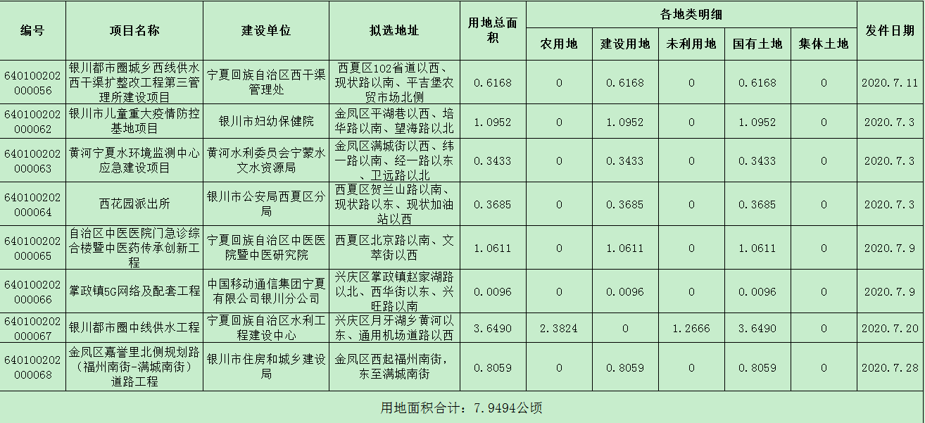 2020年7月银川市自然资源局核发建设项目用地预审与选址意见书情况